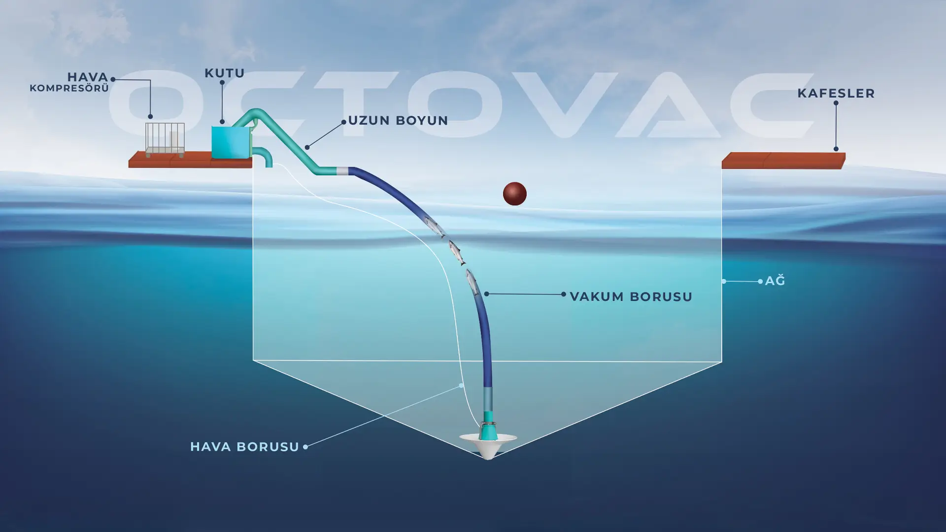 Octovac; ölü balıkların üretim döngüsü içerisinden kolayca çıkarılması amacıyla tasarlanan, farklı kafes boyutlarına uygun ve uzaktan kontrol edilebilen bir sistemdir.
